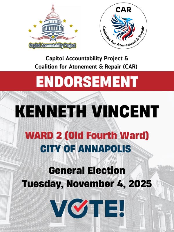 Last fall, Mayor Buckley asked the Coalition for Atonement & Repair (CAR) to draft an apology on behalf of the City of Annapolis to the Old Fourth Ward. We responded with a resolution titled "Commitment to Repair: Apology to the Old Fourth Ward"—a document grounded in truth, history, and moral responsibility to those displaced, erased, and dishonored by urban renewal.